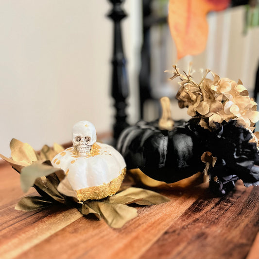 P7- Halloween Pumpkin Decoration - White with Skull and Gold Detail
