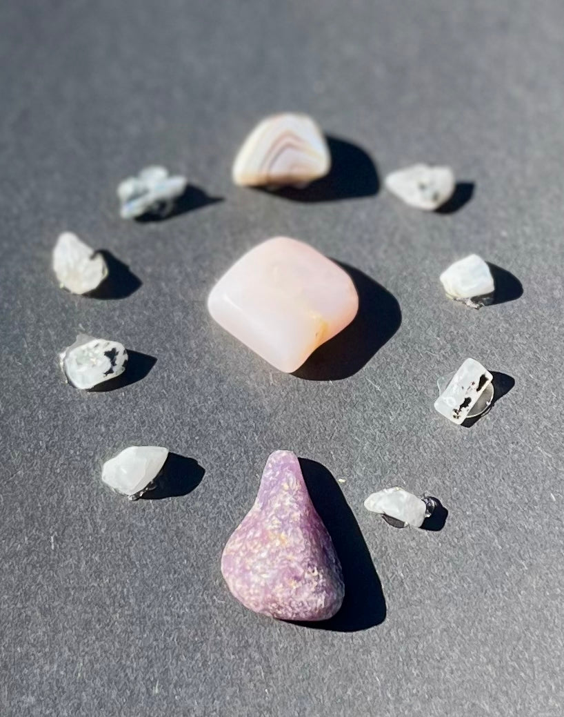 1x Lepidolite (purple), at the bottom of the grid. Lepidolite can help us to release our suffering. In times of grief, we often hold on to those hard feelings, as a way of staying connected to our lost ones. However, love only wants the best for us, and doesn’t want us to suffer. Lepidolite can help us let go of that suffering, even if just for a moment, so we can feel the love.