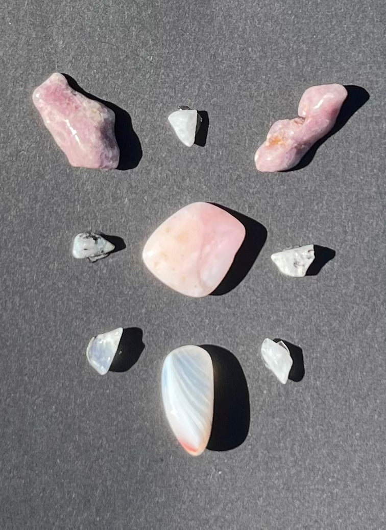 1x Pink Opal, at the centre, to bring Compassion. It is important when grieving to feel compassion for ourselves.